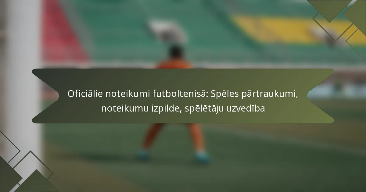 Futbola tenisā spēles pārtraukumi var notikt traumu, laikapstākļu vai strīdu dēļ, un tos regulē izveidoti protokoli, lai nodrošinātu godīgumu un drošību. Noteikumu izpildi uzrauga tiesneši un amatpersonas, kas kontrolē spēlētāju uzvedību un piemēro sodus par pārkāpumiem. Sportiskuma un cieņas uzturēšana starp spēlētājiem ir būtiska, veicinot pozitīvu vidi un nodrošinot spēles integritāti.