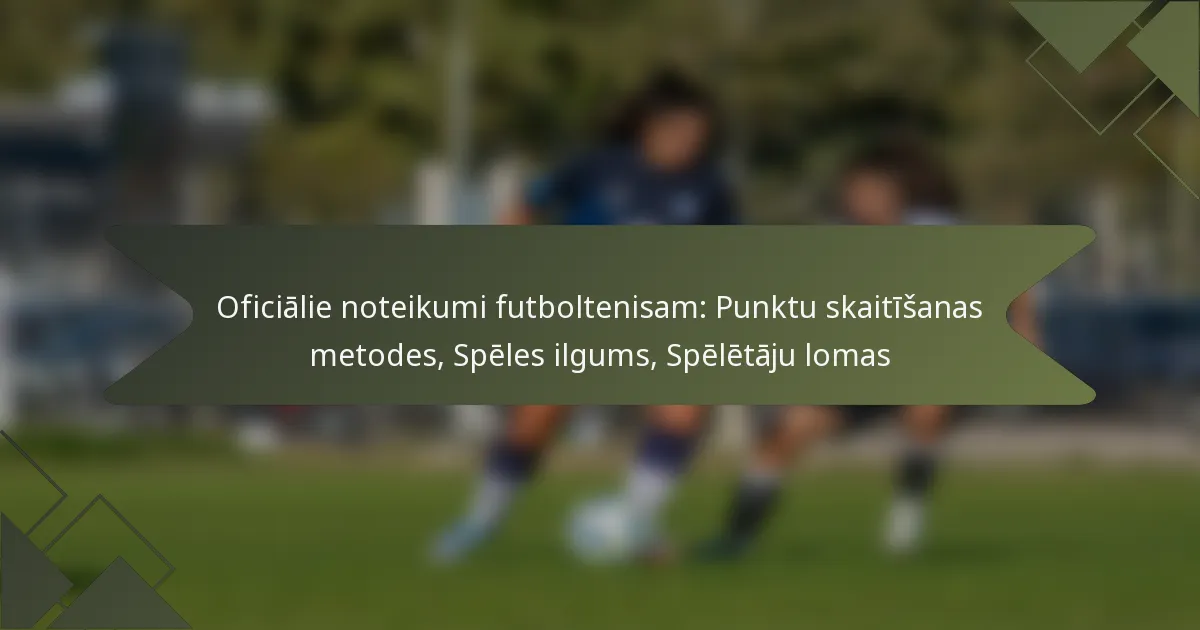 Futbola teniss apvieno futbola un tenisa elementus, izmantojot punktu sistēmu, kurā spēlētāji vai komandas gūst punktus, uzvarot izspēlēs. Spēles var notikt vieninieku vai dubultspēļu formātā, parasti ilgstot no 30 līdz 60 minūtēm, un ietver specifiskas punktu skaitīšanas noteikumus. Spēlētāju lomas ir būtiskas, jo katram dalībniekam ir noteiktas atbildības, kas ietekmē komandas kopējo stratēģiju un sniegumu.
