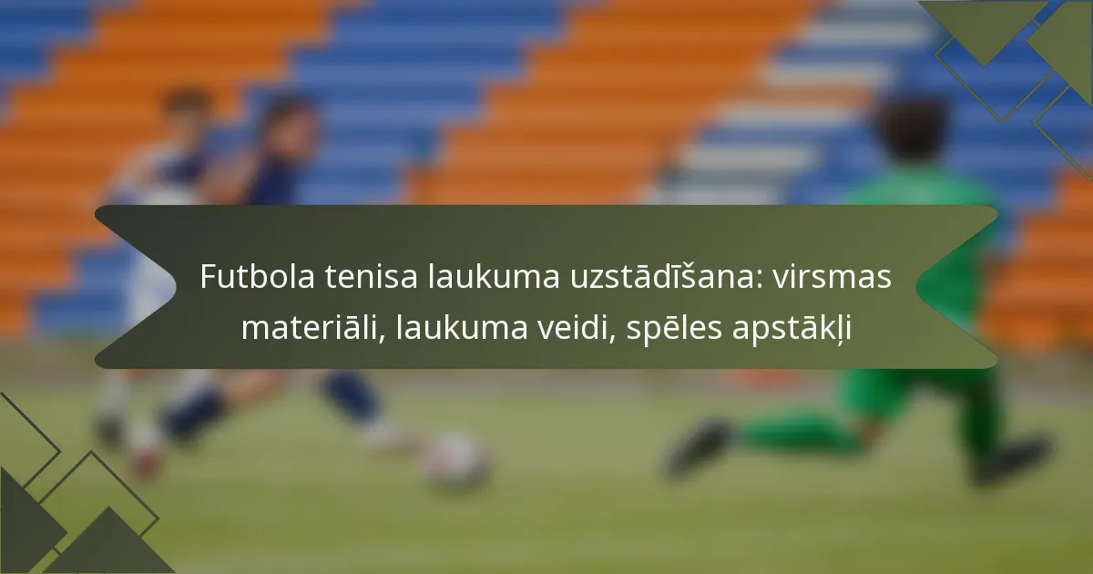 Futbola tenisa laukuma izveide prasa rūpīgu virsmas materiālu izvēli, kas var ietvert dabīgu zāli, mākslīgo zāli, mālu un cietās seguma iespējas. Katram virsmas tipam ir unikālas īpašības, kas ietekmē spēli, apkopi un spēlētāju pieredzi. Turklāt laukuma veida izvēle un esošie spēles apstākļi, piemēram, apgaismojums un laika apstākļi, spēlē būtisku lomu, uzlabojot sniegumu un spēles baudījumu.